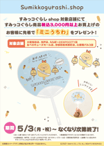 対象のすみっコぐらしshopにて、すみっコぐらし商品3,000円(税込)以上お買い上げのお客様に先着で「ミニうちわ」をプレゼントいたします。