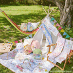 おしゃれな衣装をきたすみっコ達がのんびりたのしくキャンプ中♪