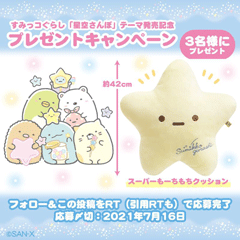 これを記念して、すみっコぐらし公式Twitterをフォロー、対象のツイートをリツイートすると、「スーパーもーちもちクッション」が抽選で3名様に当たるキャンペーンを開催☆