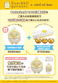 キッシュシュクレを1BOX(3個入り)ご購入のお客様限定で、てのりぬいぐるみ1点をご購入いただけます。