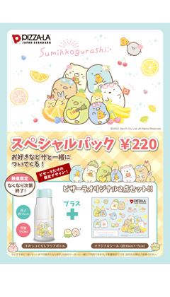 ピザをご購入いただくと、+220円(税込)で「ピザーラオリジナル すみっコぐらしクリアボトル+オリジナルシール」がご購入いただけます!