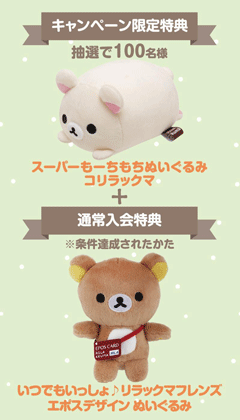 今回は期間中にお申込みいただいた方から抽選で100名様に「スーパーもーちもちぬいぐるみ コリラックマ」(サイズ:約90×110×150o)をプレゼント♪