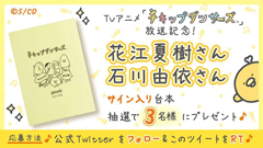 10月5日からスタート♪TVアニメ放送を記念して、チキップダンサーズ公式Twitterアカウントをフォロー、対象のツイートをリツイートすると、「声優の花江夏樹さん・石川由依さんのサイン入り台本」が抽選で5名様に当たるキャンペーンを開催☆