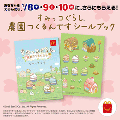 2022年1月8日(土)・9日(日)・10日(祝)の3連休中にハッピーセット「すみっコぐらし」を買うと、「すみっコぐらし 農園つくるんです シールブック」がもらえます。