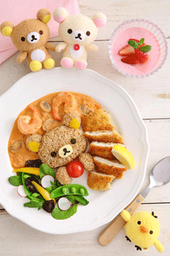 リラックマの顔がかわいく作れちゃう!味付きごはん付きの「リラックマの海老トマトクリーム煮」や、フライパンで簡単に手軽に時短で作れる「ハーブチキンカツ&サラダ」、コリラックマが大好きないちごを使った「いちごのベリームース」など、リラックマがいっぱいのメニューです♪