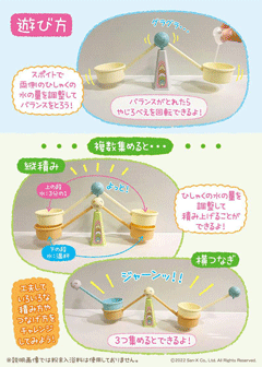 付属のハート型スポイトで、やじろべえのひしゃくに少しづつ水を入れ、バランスをとって楽しめる☆