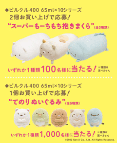 さらに、すみっコぐらしパッケージの購入レシートで、抱き心地抜群の「スーパーもーちもち抱きまくら」を抽選で100名様に、みんな大好き「てのりぬいぐるみ」を抽選で1,000名様にプレゼントするキャンペーンも実施します♪