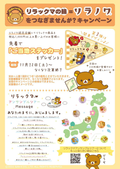 リラノワ認定店舗にて、リラックマ商品を1,000円以上(税込)お買い上げの方に、先着で「ご当地ステッカー」をプレゼント!