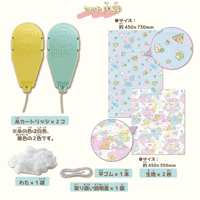 専用別売りセットは、すみっコぐらし柄のオリジナル生地2種類と、白色と紫色の糸カーリッジ2個入り!