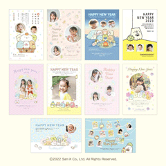 年賀状デザインとして毎年ご好評をいただいている花柄や流行りのキャンプをモチーフにした柄に加え、お正月のご挨拶にぴったりな鏡餅になったすみっコたちの絵柄など、お好みに合わせてお選びいただける様々なテイストをご用意♪