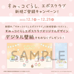期間中、エポスカード会員ならどなたでも無料で参加できるコミュニティサイト「すみっこぐらしエポスクラブ」にご登録いただくと、すみっコぐらしエポスクラブオリジナルデザインの「デジタル壁紙」をもれなくプレゼント☆