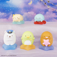 すみっコたちがクリアでカラフルなお星さまに乗っている、可愛らしさ満点のソフビ人形です☆