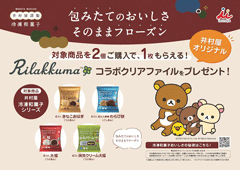 井村屋の冷凍和菓子(4コ入シリーズ)を2個ご購入いただくと、店頭に設置してあるリラックマコラボの井村屋オリジナルクリアファイルを1枚プレゼントいたします☆