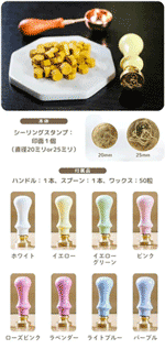 セットには、2サイズから選べるシーリングスタンプの印面と8色から選べるかわいいハンドルが1本、14色から選べるワックスが50粒、ワックスを熱するためのスプーンが付属しています!
