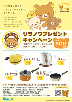 全国のリラノワ認定店舗で1,100円(税込)以上のリラックマ商品をお買い上げでもらえる応募はがきを送ると、抽選で素敵なリラックマグッズをプレゼント♪