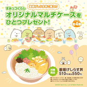 キャンペーン対象商品の「釜揚げしらす丼」1食をお買い上げのお客さまに、先着ですみっコぐらしオリジナルマルチケース(ランダム全4種)をひとつプレゼント!