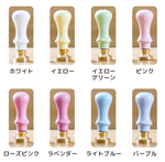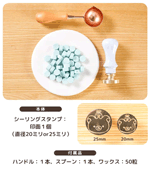 セットには、直径20ミリか25ミリが選べるシーリングスタンプの印面と8色から選べるかわいいハンドルが1本、14色から選べるワックスが50粒、ワックスを熱するためのスプーンが付属しています!