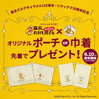 Aレシートを「森永のおかしなおかし屋さん」でご提示の上、指定のミルクキャラメル商品1つ以上を含む、1,200円(税込)以上の商品を購入でオリジナル巾着をプレゼント。