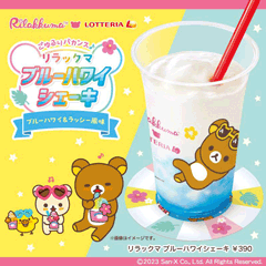 バカンスをエンジョイするリラックマがデザインされたカップに入った、ブルーハワイソース&ラッシー風味の夏らしさ満載なシェーキ♪