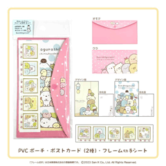 すみっコたちのフレーム切手シート(63円×5枚)と集合デザインのポストカード2種、専用PVCポーチがセットに♪