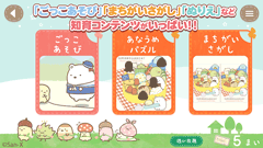 すみっコぐらしのぬりえやパズル、まちがいさがし、ごっこあそびなど「すみっコぐらし」の世界に触れながら楽しく遊べる知育コンテンツがいっぱい♪