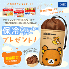 DHC通販またはDHC直営店で、「プロティンダイエットシリーズ」を一度に9,000円(税込)以上ご購入いただいた方に、リラックマデザインの保冷シェーカーカバーをプレゼントいたします。