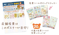 「ねこねこの湯」テーマ店頭キャンペーン対象店舗でリラックマ商品を1,100円(税込)以上購入すると、投票シール付ビックステッカーがもらえます!投票シールを総選挙ポスターに貼って投票しましょう♪