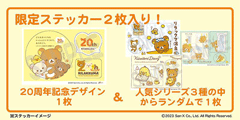 ステッカーのうち1枚は必ず入る「20周年記念デザイン」、もう1枚はリラックマの人気シリーズデザインの中からランダムで入ります(全3種類)♪