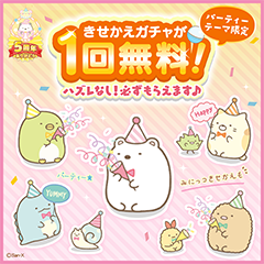 期間中、「パーティー」をモチーフにしたきせかえガチャを、1回無料でまわすことができます(ハズレなし)☆