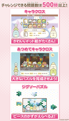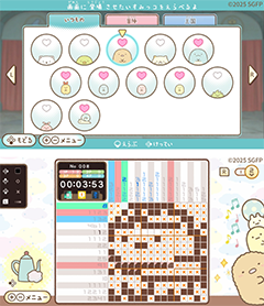 枠の外の数字をヒントにマスを埋めていくと、すみっコたちのかわいいドットイラストが完成します♪ 充実のアシスト機能で、ひとりでも親子でも楽しむことができます☆