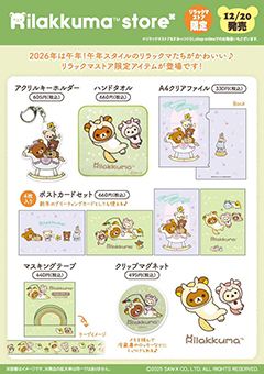 【リラックマストア限定】12月ノベルティ&商品のお知らせ 『Makeup Rilakkuma』テーマに限定のぶらさげぬいぐるみが登場!! 仲良くお揃いのリボンを持っているよ♡ 2026年は午年! 午年にちなんだカウボーイ風の衣装を着たリラックマたちの限定ぬいぐるみや雑貨が登場! 2026年だけの特別なリラックマたちと新年を迎えよう♪ さらに、ノベルティのプレゼントもありますよ♪ ※店舗の状況によっては、予告なく整理券の配布等、混雑緩和の為の対策を行う可能性がございます。 ※別途お知らせがある場合は、リラックマストア&すみっコぐらしshop公式X(旧Twitter)<@_rks_official> 等でご案内いたします。 リラックマストア&すみっコぐらしshop公式X(旧Twitter)はこちら→https://twitter.com/_rks_official ●ノベルティ● リラックマストアにて、リラックマ商品を4,400円(税込)以上お買い上げのお客様に、Makeup Rilakkumaデザインの「ミニマルチクリアケース」を先着でプレゼント! 配布日:2025年12月20日(土)〜なくなり次第終了 配布店舗:リラックマストア全店 ※数量限定のため、無くなり次第終了となります。 ※1会計につき1点のプレゼントとさせて頂きます。 また、お会計時にお連れ様がいらした場合でも、1会計でお渡しできるノベルティは1点となります。 ※他のノベルティ企画と開催期間が重複した場合、企画ごとにお渡しできるノベルティ数が異なる場合がございます。 詳しくは各店舗にお問い合わせください。 ●リラックマストア限定商品● 数量限定販売 <販売店舗・発売日> リラックマストア全店:2025年12月20日(土) サンエックスネットショップ:2025年12月22日(月)10:00〜 リラックマストア&すみっコぐらしshop online:2025年12月22日(月)12:00〜 ※1会計につき各1点までの販売とさせていただきます。 ※購入点数制限のある商品について、お会計時にお連れ様がいらした場合でも1会計につき上記数量までとさせていただきます。 ※サンエックスネットショップでの購入制限はサイトをご確認ください。 ※東京スカイツリータウン・ソラマチ店、仙台店、名古屋店、あべのキューズモール店、京都四条河原町店、心斎橋パルコ店、札幌パルコ店、マルイシティ横浜店、新宿店では、レジにてご用意、または入店時にスタッフから手渡しいたします。スタッフがお渡しいたしますので、商品はお選びいただけません。 ★店舗での事前予約などは受付けておりませんのでご了承ください。 ★品切れ等も予想されますので、商品の取り扱いがあるかどうかを事前にお問い合わせの上お出かけください。 数量限定販売 <販売店舗・発売日> リラックマストア全店:2025年12月20日(土) サンエックスネットショップ:2025年12月22日(月)10:00〜 リラックマストア&すみっコぐらしshop online:2025年12月22日(月)12:00〜 ※1会計につき各1点までの販売とさせていただきます。 ※購入点数制限のある商品について、お会計時にお連れ様がいらした場合でも1会計につき上記数量までとさせていただきます。 ※サンエックスネットショップでの購入制限はサイトをご確認ください。 ※東京スカイツリータウン・ソラマチ店、仙台店、名古屋店、あべのキューズモール店、京都四条河原町店、心斎橋パルコ店、札幌パルコ店、新宿店では、レジにてご用意、または入店時にスタッフから手渡しいたします。スタッフがお渡しいたしますので、商品はお選びいただけません。 ★店舗での事前予約などは受付けておりませんのでご了承ください。 ★品切れ等も予想されますので、商品の取り扱いがあるかどうかを事前にお問い合わせの上お出かけください。 数量限定販売 <販売店舗・発売日> リラックマストア全店:2025年12月20日(土) リラックマストア&すみっコぐらしshop online:2025年12月22日(月)12:00〜 ★店舗での事前予約などは受付けておりませんのでご了承ください。 ★品切れ等も予想されますので、商品の取り扱いがあるかどうかを事前にお問い合わせの上お出かけください。 ※詳しくは、各店舗までお問い合わせ下さい。 大阪梅田店 TEL 06-6372-7708 東京駅店 TEL 03-3213-5501 福岡パルコ店 TEL 092-235-7294 吉祥寺店 TEL 0422-29-2155 東京スカイツリータウン・ソラマチ店 TEL 03-5610-7228 原宿店 TEL 03-3409-3431 仙台店 TEL 022-714-8015 神戸店 TEL 078-366-6833 ららぽーと富士見店 TEL 049-255-5916 ららぽーとEXPOCITY店 TEL 06-6877-1112 名古屋店 TEL 052-566-6703 池袋サンシャインシティ店 TEL 03-5952-5312 あべのキューズモール店 TEL 06-4394-8091 京都四条河原町店 TEL 075-241-3377 心斎橋パルコ店 TEL 06-6243-0702 越谷レイクタウン店 TEL 048-940-8677 札幌パルコ店 TEL 011-211-0730 マルイシティ横浜店 TEL 045-577-0737 名古屋パルコ店 TEL 052-684-7870 新宿店 TEL03-5925-8631 リラックマストア&すみっコぐらしshop online https://store.shopping.yahoo.co.jp/rilakkumastore/ サンエックスネットショップ:https://shop.san-x.co.jp/