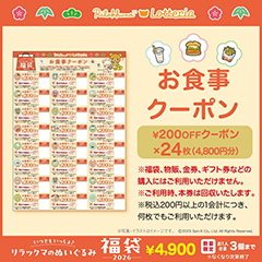 福袋の中身は、リラックマファン待望のコラボ限定ぬいぐるみを含めた4つのアイテムとお食事クーポン。