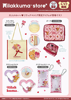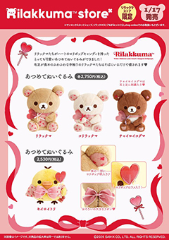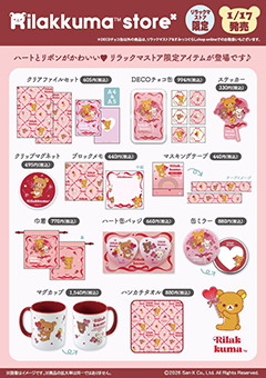 【リラックマストア限定】ハートテーマのアイテムが登場♪ リラックマたちがハートのロリポップキャンディを手に持った とっても可愛いあつめてぬいぐるみができました! さらに、大人かわいい雑貨やバッグなどのアイテムも登場♡ ノベルティのプレゼントもありますよ♪ ※店舗の状況によっては、予告なく整理券の配布等、混雑緩和の為の対策を行う可能性がございます。 ※別途お知らせがある場合は、リラックマストア&すみっコぐらしshop公式X(旧Twitter)<@_rks_official> 等でご案内いたします。 リラックマストア&すみっコぐらしshop公式X(旧Twitter)はこちら→https://twitter.com/_rks_official ●ノベルティ● リラックマストアにて、リラックマ商品を4,400円(税込)以上お買い上げのお客様に、「ロリポップアクリルキーホルダー」を先着でプレゼント! 配布日:2026年1月17日(土)〜なくなり次第終了 配布店舗:リラックマストア全店 ※数量限定のため、無くなり次第終了となります。 ※1会計につき1点のプレゼントとさせて頂きます。 また、お会計時にお連れ様がいらした場合でも、1会計でお渡しできるノベルティは1点となります。 ※他のノベルティ企画と開催期間が重複した場合、企画ごとにお渡しできるノベルティ数が異なる場合がございます。 詳しくは各店舗にお問い合わせください。 ●リラックマストア限定商品● 数量限定販売 <販売店舗・発売日> リラックマストア全店:2026年1月17日(土) サンエックスネットショップ:2025年1月19日(月)10:00〜 リラックマストア&すみっコぐらしshop online:2026年1月19日(月)12:00〜 ※1会計につき各1点までの販売とさせていただきます。 ※購入点数制限のある商品について、お会計時にお連れ様がいらした場合でも1会計につき上記数量までとさせていただきます。 ※サンエックスネットショップ、リラックマストア&すみっコぐらしshop onlineでの購入制限はサイトをご確認ください。 ※札幌パルコ店、仙台店、東京スカイツリータウン・ソラマチ店、越谷レイクタウン店、マルイシティ横浜店、名古屋店、京都四条河原町店、あべのキューズモール店、心斎橋パルコ店では、レジにてご用意、または入店時にスタッフから手渡しいたします。スタッフがお渡しいたしますので、商品はお選びいただけません。 ★店舗での事前予約などは受付けておりませんのでご了承ください。 ★品切れ等も予想されますので、商品の取り扱いがあるかどうかを事前にお問い合わせの上お出かけください。 数量限定販売 <販売店舗・発売日> リラックマストア全店:2026年1月17日(土) リラックマストア&すみっコぐらしshop online:2026年1月19日(月)12:00〜 ※DECOチョコ缶は、リラックマストア&すみっコぐらしshop onlineでのお取り扱いはございません。 ★店舗での事前予約などは受付けておりませんのでご了承ください。 ★品切れ等も予想されますので、商品の取り扱いがあるかどうかを事前にお問い合わせの上お出かけください。 数量限定販売 <販売店舗・発売日> リラックマストア全店:2026年1月17日(土) リラックマストア&すみっコぐらしshop online:2026年1月19日(月)12:00〜 ★店舗での事前予約などは受付けておりませんのでご了承ください。 ★品切れ等も予想されますので、商品の取り扱いがあるかどうかを事前にお問い合わせの上お出かけください。 数量限定販売 <販売店舗・発売日> リラックマストア全店:2026年1月17日(土) リラックマストア&すみっコぐらしshop online:2026年1月19日(月)12:00〜 ※1会計につき4点までの販売とさせていただきます。 ※購入点数制限のある商品について、お会計時にお連れ様がいらした場合でも1会計につき上記数量までとさせていただきます。 ★店舗での事前予約などは受付けておりませんのでご了承ください。 ★品切れ等も予想されますので、商品の取り扱いがあるかどうかを事前にお問い合わせの上お出かけください。 ※詳しくは、各店舗までお問い合わせ下さい。 札幌パルコ店 TEL 011-211-0730 仙台店 TEL 022-714-8015 ららぽーと富士見店 TEL 049-255-5916 越谷レイクタウン店 TEL 048-940-8677 東京駅店 TEL 03-3213-5501 吉祥寺店 TEL 0422-29-2155 東京スカイツリータウン・ソラマチ店 TEL 03-5610-7228 原宿店 TEL 03-3409-3431 池袋サンシャインシティ店 TEL 03-5952-5312 新宿店 TEL03-5925-8631 マルイシティ横浜店 TEL 045-577-0737 名古屋店 TEL 052-566-6703 名古屋パルコ店 TEL 052-684-7870 京都四条河原町店 TEL 075-241-3377 大阪梅田店 TEL 06-6372-7708 ららぽーとEXPOCITY店 TEL 06-6877-1112 あべのキューズモール店 TEL 06-4394-8091 心斎橋パルコ店 TEL 06-6243-0702 神戸店 TEL 078-366-6833 福岡パルコ店 TEL 092-235-7294 リラックマストア&すみっコぐらしshop online https://store.shopping.yahoo.co.jp/rilakkumastore/ サンエックスネットショップ:https://shop.san-x.co.jp/