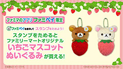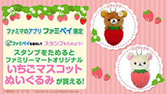 ファミリーマートでファミペイアプリを提示してスタンプをためると、リラックマ&コリラックマのファミリーマート限定いちごマスコットぬいぐるみが買えるキャンペーンを開催中!