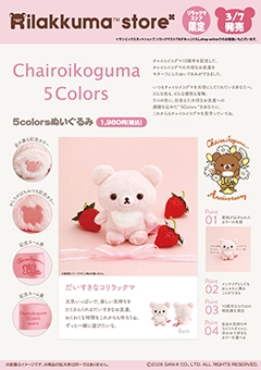 【リラックマストア限定】3月ノベルティ&商品のお知らせ 有楽町マルイで開催中の期間限定ショップ『コリコグストア〜くまきゅん〜フラワーマルシェ〜』で 先行販売しているチャイロイコグマ10周年記念アイテムがリラックマストアでも登場です! 一緒にチャイロイコグマの10周年をお祝いしよう☆ さらに!新宿スーベニアのリラックマたちとおそろい!?の『ぬいぐるみリュック』や、 チャイロイコグマの大切なお友達をモチーフにした『5Colorsぬいぐるみ』、コリコグストアで先行販売中のコリラックマの『ぬいぐるみポシェット』も登場です♪ ※店舗の状況によっては、予告なく整理券の配布等、混雑緩和の為の対策を行う可能性がございます。 ※別途お知らせがある場合は、リラックマストア&すみっコぐらしshop公式X(旧Twitter)<@_rks_official> 等でご案内いたします。 リラックマストア&すみっコぐらしshop公式X(旧Twitter)はこちら→https://twitter.com/_rks_official ●ノベルティ● リラックマストアにて、リラックマ商品を4,400円(税込)以上お買い上げのお客様に、チャイロイコグマのくまきゅんDaysデザインの「合皮チャーム」を先着でプレゼント! 配布日:2026年3月7日(土)〜なくなり次第終了 配布店舗:リラックマストア全店 ※数量限定のため、無くなり次第終了となります。 ※1会計につき1点のプレゼントとさせて頂きます。 また、お会計時にお連れ様がいらした場合でも、1会計でお渡しできるノベルティは1点となります。 ※他のノベルティ企画と開催期間が重複した場合、企画ごとにお渡しできるノベルティ数が異なる場合がございます。 詳しくは各店舗にお問い合わせください。 ●リラックマストア限定商品● 数量限定販売 <販売店舗・発売日> リラックマストア全店:2026年3月7日(土) サンエックスネットショップ:2026年2月20日(金)10:00〜 リラックマストア&すみっコぐらしshop online:2026年2月20日(金)12:00〜 ※1会計につき1点までの販売とさせていただきます。 ※購入点数制限のある商品について、お会計時にお連れ様がいらした場合でも1会計につき上記数量までとさせていただきます。 ※サンエックスネットショップ、リラックマストア&すみっコぐらしshop onlineでの購入制限はサイトをご確認ください。 ※札幌パルコ店、越谷レイクタウン店、東京スカイツリータウン・ソラマチ店、原宿店、池袋サンシャインシティ店、マルイシティ横浜店、名古屋店、京都四条河原町店、あべのキューズモール店、心斎橋パルコ店では、レジにてご用意、または入店時にスタッフから手渡しいたします。スタッフがお渡しいたしますので、商品はお選びいただけません。 ★店舗での事前予約などは受付けておりませんのでご了承ください。 ★品切れ等も予想されますので、商品の取り扱いがあるかどうかを事前にお問い合わせの上お出かけください。 数量限定販売 <販売店舗・発売日> リラックマストア全店:2026年3月7日(土) サンエックスネットショップ:2026年2月20日(金)10:00〜 リラックマストア&すみっコぐらしshop online:2026年2月20日(金)12:00〜 ※1会計につき1点までの販売とさせていただきます。 ※購入点数制限のある商品について、お会計時にお連れ様がいらした場合でも1会計につき上記数量までとさせていただきます。 ※サンエックスネットショップ、リラックマストア&すみっコぐらしshop onlineでの購入制限はサイトをご確認ください。 ※札幌パルコ店、越谷レイクタウン店、東京スカイツリータウン・ソラマチ店、原宿店、池袋サンシャインシティ店、マルイシティ横浜店、名古屋店、京都四条河原町店、あべのキューズモール店、心斎橋パルコ店では、レジにてご用意、または入店時にスタッフから手渡しいたします。スタッフがお渡しいたしますので、商品はお選びいただけません。 ★店舗での事前予約などは受付けておりませんのでご了承ください。 ★品切れ等も予想されますので、商品の取り扱いがあるかどうかを事前にお問い合わせの上お出かけください。 数量限定販売 <販売店舗・発売日> リラックマストア全店:2026年3月7日(土) サンエックスネットショップ:2026年2月20日(金)10:00〜 リラックマストア&すみっコぐらしshop online:2026年2月20日(金)12:00〜 ★店舗での事前予約などは受付けておりませんのでご了承ください。 ★品切れ等も予想されますので、商品の取り扱いがあるかどうかを事前にお問い合わせの上お出かけください。 数量限定販売 <販売店舗・発売日> リラックマストア新宿店先行販売:2026年3月7日(土) サンエックスネットショップ:2026年3月9日(月)10:00〜 リラックマストア&すみっコぐらしshop online:2026年3月9日(月)12:00〜 リラックマストア全店(新宿店を除く):2026年4月11日(土) ※1会計につき各1点までの販売とさせていただきます。 ※購入点数制限のある商品について、お会計時にお連れ様がいらした場合でも1会計につき上記数量までとさせていただきます。 ※サンエックスネットショップ、リラックマストア&すみっコぐらしshop onli
